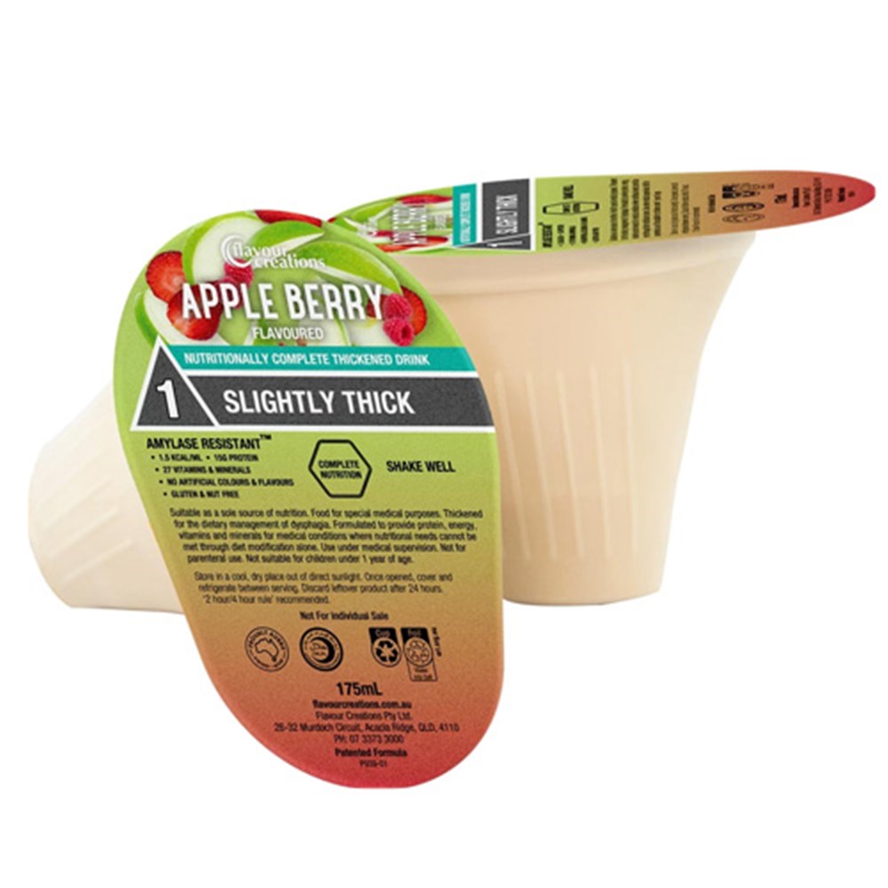 Perfectly balanced fruit flavour, the ready-to-drink Nutritionally Complete Apple Berry drink offers refreshing hydration, packed with 15 grams of protein and 27 vitamin and minerals. This nutritional supplement is thickened for those with swallowing difficulties (dysphagia), and packed in the award-winning patented Dysphagia Cup.