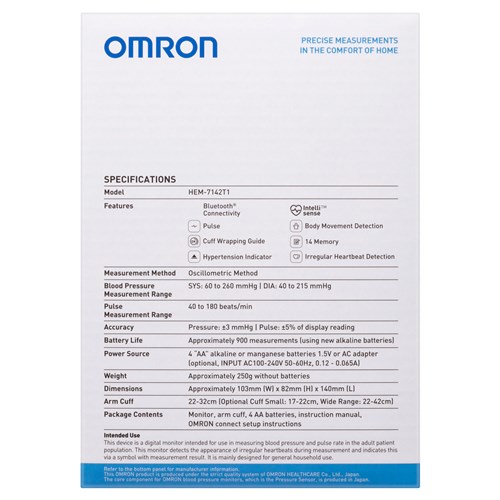 The Omron HEM7142T1 Standard (Medium Cuff) Blood Pressure Monitor is designed with simplicity and convenience in mind, offering one-touch operation and irregular heartbeat detection. It includes a cuff wrapping guide that ensures proper placement, making it an excellent choice for first-time users with an upper arm circumference of 22-32cm.