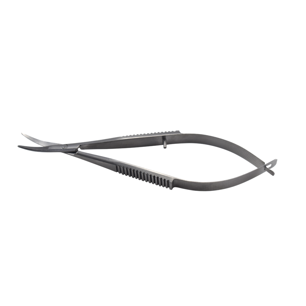 Castroviejo scissors are double-spring ophthalmic scissors commonly used in procedures such as iridectomy and corneal surgery. This 10cm model features flat handles and blunt/blunt curved tips for controlled, delicate cutting.