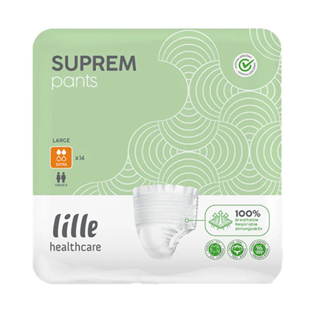 Suitable for men and women, the Lille Suprem Pants Extra pull-up is an ideal solution for managing urinary incontinence in active and mobile people. Combining comfort and discretion, the disposable pants contain Lille Air System technology that provides 100% breathability which reduces the occurrence of rashes, allowing your skin to breathe and stay dry. Can be worn like any regular underwear and taken off by tearing the sides.? The incontinence pants have a wetness indicator that turns blue depending on the saturation, indicating the need to change. There is an adhesive strip to indicate the back and can be used as a disposal tape to compact the pants.?