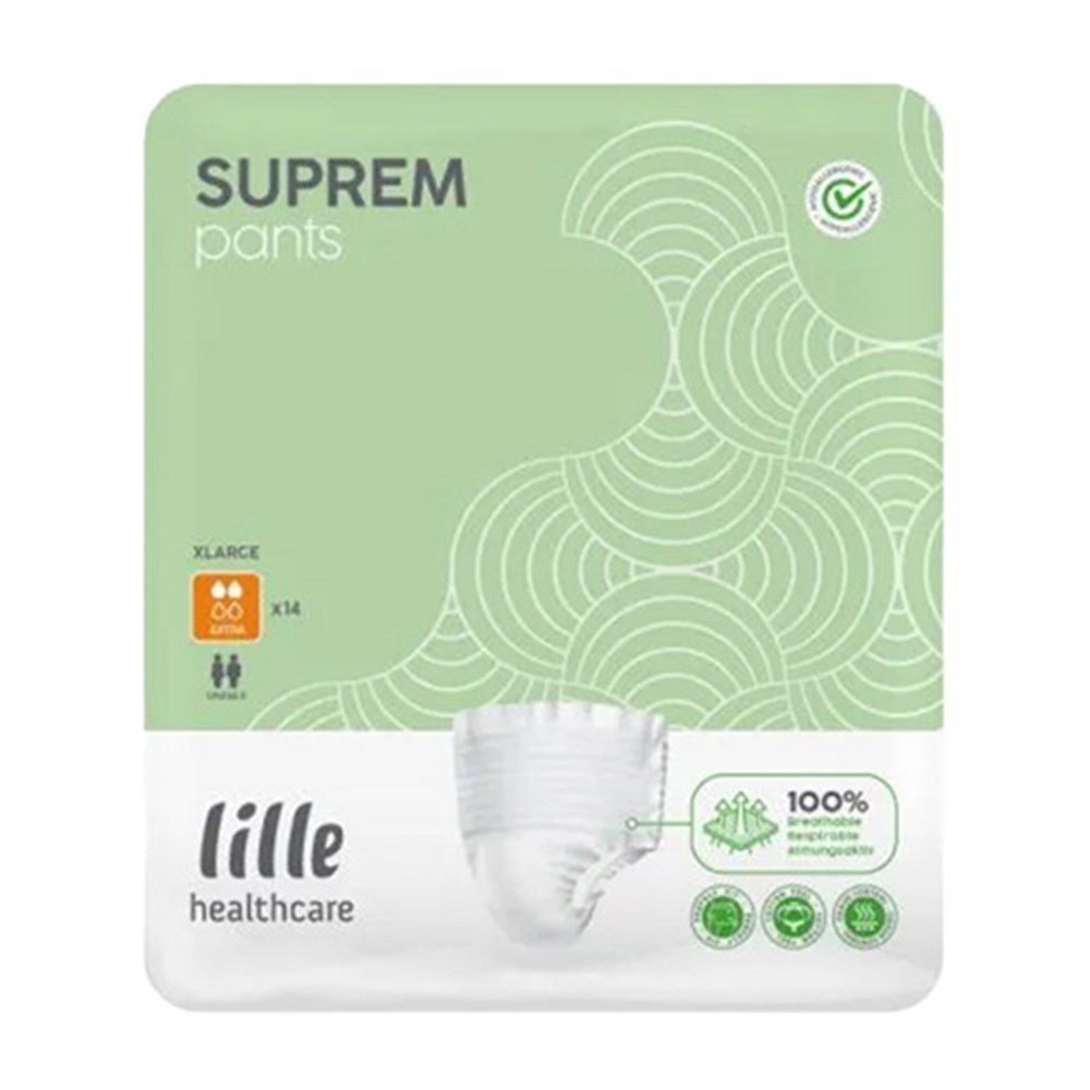 Suitable for men and women, the Lille Suprem Pants Extra pull-up is an ideal solution for managing urinary incontinence in active and mobile people. Combining comfort and discretion, the disposable pants contain Lille Air System technology that provides 100% breathability which reduces the occurrence of rashes, allowing your skin to breathe and stay dry. Can be worn like any regular underwear and taken off by tearing the sides.? The incontinence pants have a wetness indicator that turns blue depending on the saturation, indicating the need to change. There is an adhesive strip to indicate the back and can be used as a disposal tape to compact the pants.?