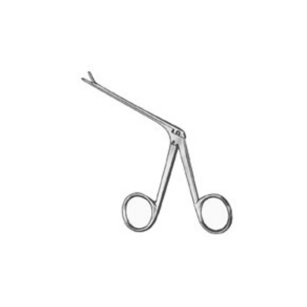 Delicate, angled cupped forceps for precision use in ENT and microsurgical procedures.