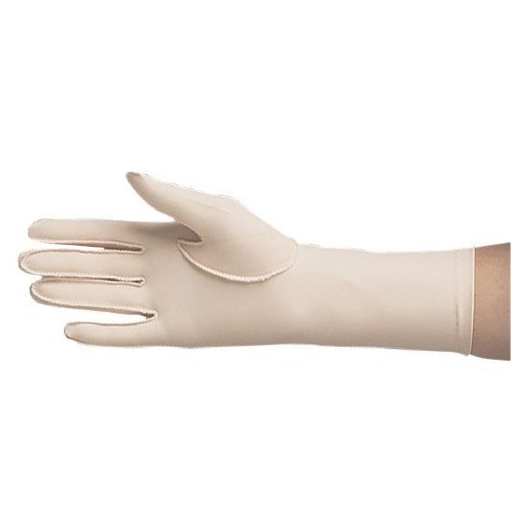 Latex free and comfortable for extended wear, the gloves provide gentle compression of approximately 15–25 mmHg to help reduce swelling in edematous tissue. The over-the-wrist length extends 3 inches (7.6 cm) beyond the wrist crease for added coverage and support. Gloves are sold individually. For accurate sizing, measure the circumference around the knuckles.
