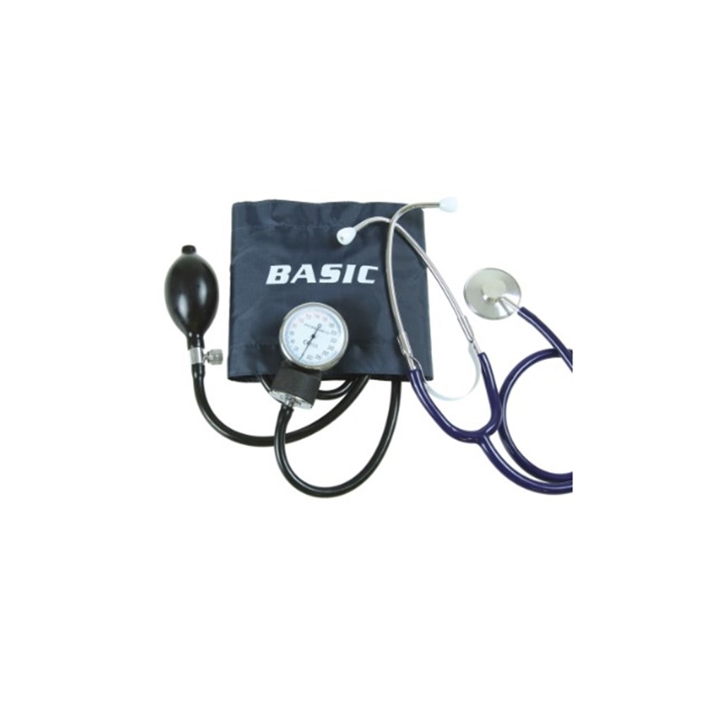 Overview This Basic Two-Hand Aneroid Sphygmomanometer with Stethoscope is a traditional, dual-hand operated device designed for accurate and dependable blood pressure measurement. The set includes an aneroid manometer, a basic stethoscope, and a standard adult cuff housed in a protective leatherette zip case — ideal for healthcare professionals, students, and home users alike. Key Features Two-handed operation for reliable manual blood pressure measurement. Aneroid sphygmomanometer featuring a black enamel 300 mmHg no-stop-pin manometer. Includes basic stethoscope for convenient, complete blood pressure assessment. Comes with adult Velcro cuff fitted with a latex-free bladder, dual tubes, bulb, and intake valve. Durable storage case – supplied in a leatherette zip pouch for protection and portability. Cuff options available in other sizes (sold separately). Manufactured in China to standard clinical specifications. Note: This product is not latex-free.