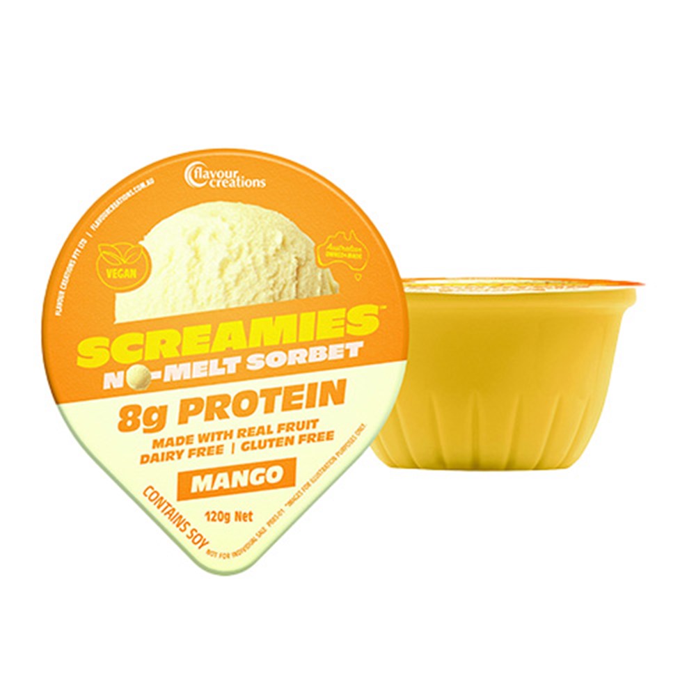 SCREAMIES No-Melt Sorbet Mango is a creamy, tropical and nutritious snack made with real fruit and delivering high energy and 8g of plant-based soy protein per serve. ??Proudly Australian made, SCREAMIES Sorbet Mango features a specialised shelf-stable Amylase Resistant™ formula and meets IDDSI Level 4 Pureed standards, making it safe for people living with dysphagia.
