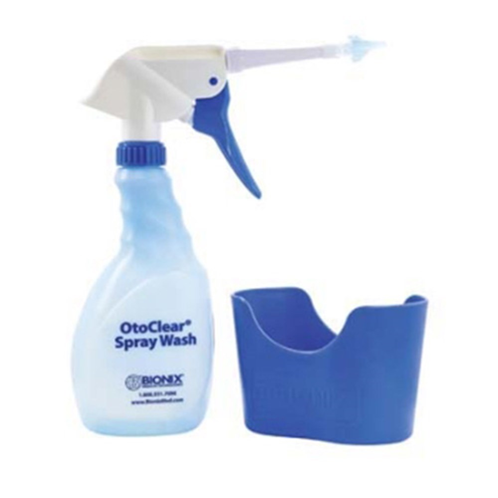 - The OtoClear Spray Wash Kit combines a 470ml bottle with a powerful actuator. For a safe, effective and efficient ear lavage, the Spray Wash trigger is manually squeezed creating an intermittent pulsed lavage to loosen and remove cerumen.