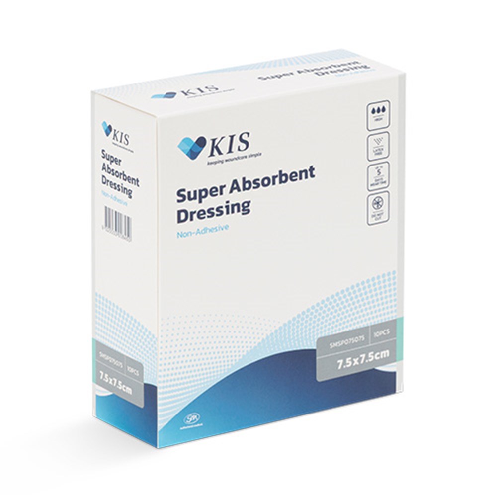 KIS Super Absorbent Dressing is a non-adherent wound dressing that helps to maintain a moist wound surface environment.The dressing comprises an absorbent core to absorb and retain wound exudate, the absorbent core is enclosed in a hydrophobic, liquid permeable and breathable layer. Wound exudate is retained in the dressing core to reduce the risk of maceration and encourage wound healing.